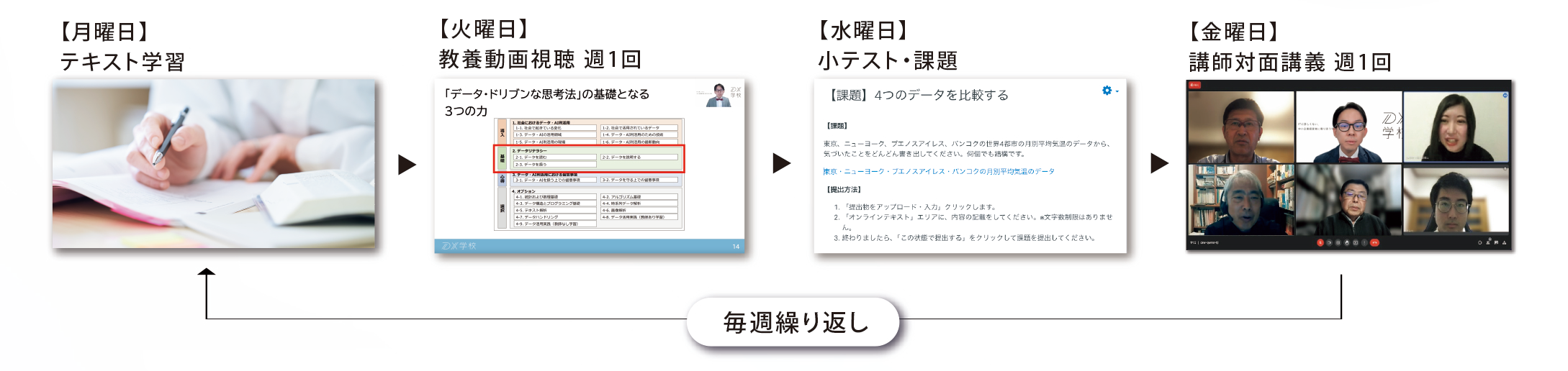 DX学校のテキストとオンライン学習システムで学び、講師と一緒に実践しながら進めます。